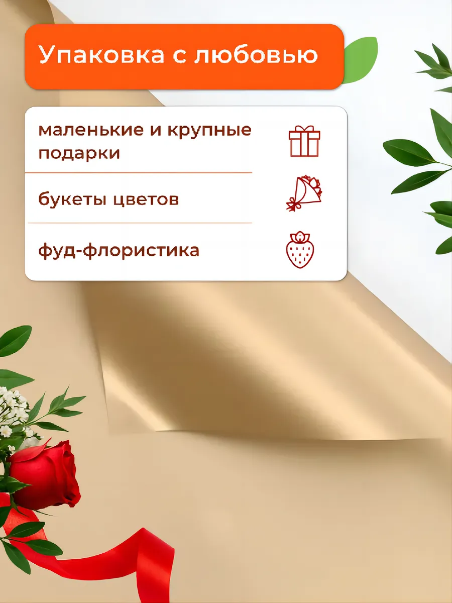 Эта пленка для цветов и для подарков цвета шампань является неотъемлемой частью каждого волшебного момента. Независимо от того, для какого случая вы ищете подарочную пленку для подарков, пленка флористическая является идеальным выбором.