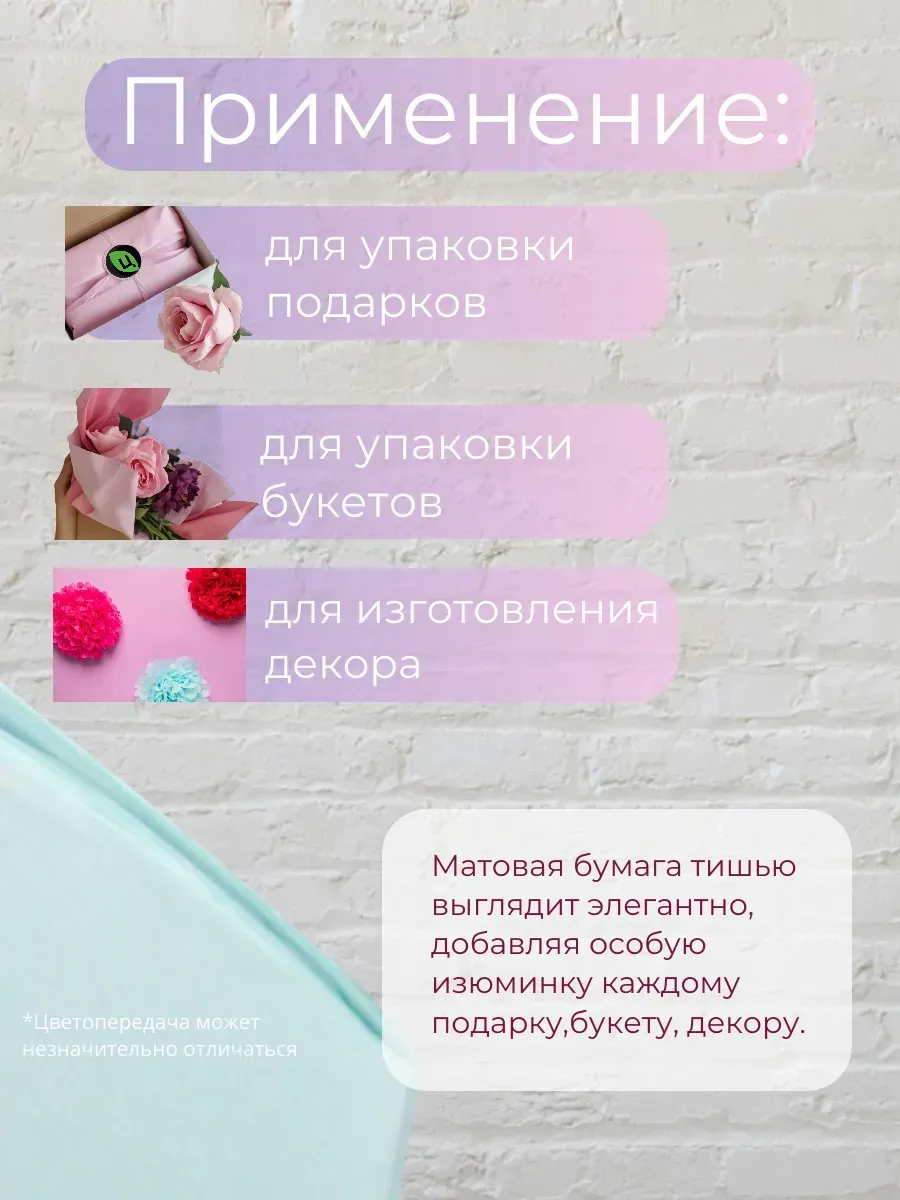 Тишью упаковочная бумага доступна в наборах разных цветов, что позволяет легко сочетать и комбинировать оттенки для создания уникальных оформлений.