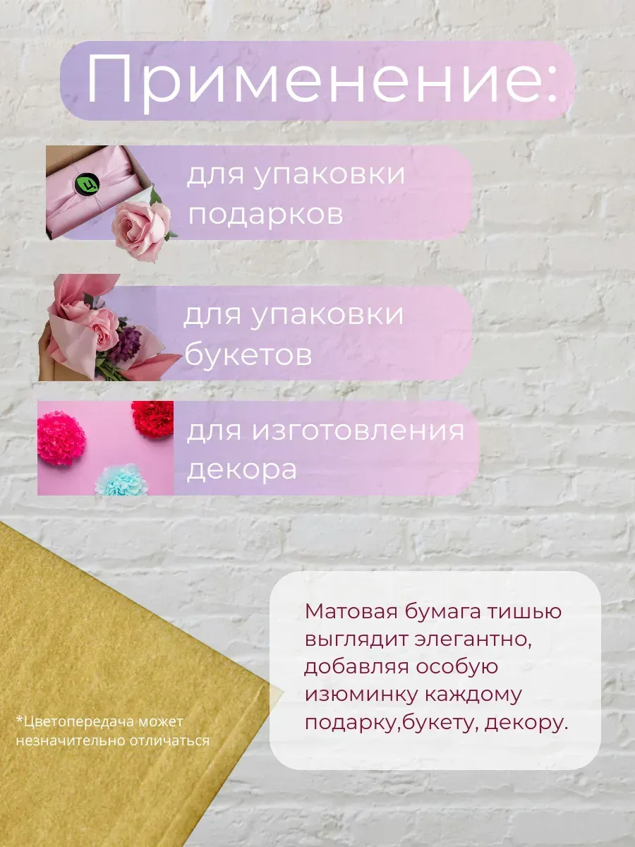Матовая бумага тишью выглядит элегантно, добавляя особую изюминку каждому подарку и букету цветов.