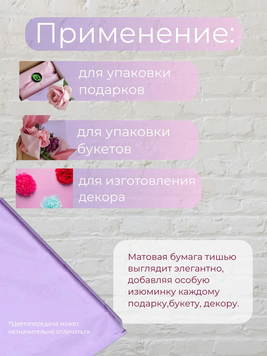 Тишью упаковочная бумага доступна в наборах разных цветов, что позволяет легко сочетать и комбинировать оттенки для создания уникальных оформлений.