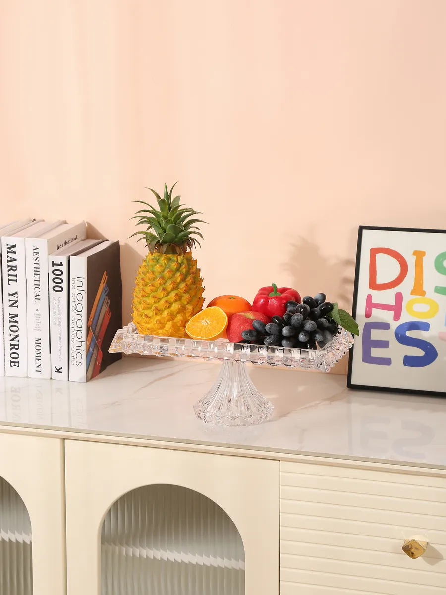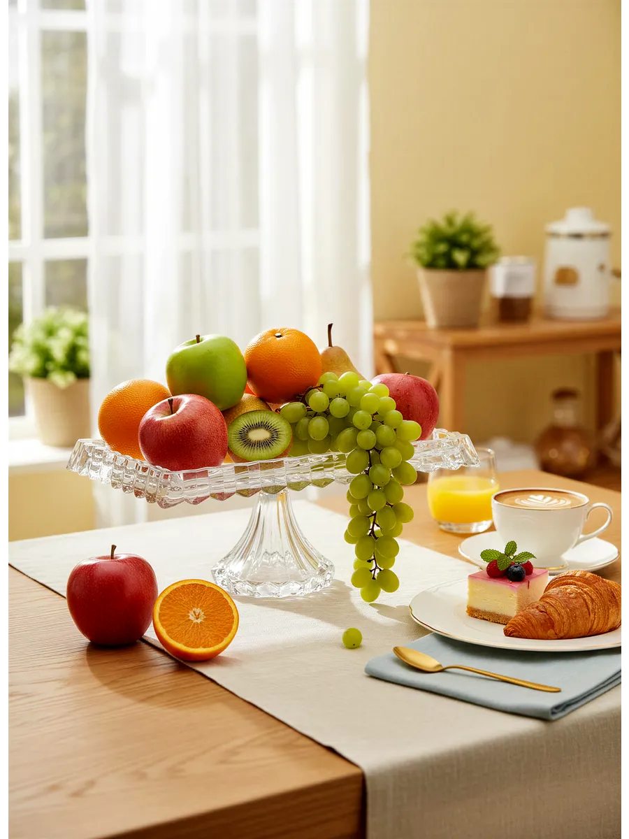 Изящная ножка с рельефными гранями и широкая тарелка с декоративным краем создают ощущение торжественности даже в будничный день. Прозрачное стекло словно наполняет пространство светом, а каждый фрукт становится драгоценным украшением стола.