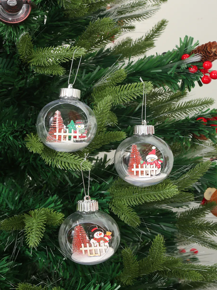 Готовы окунуться в настоящую зимнюю сказку? Перед вами волшебные прозрачные елочные шары диаметром 8 см из качественного пластика с очаровательными снеговиками внутри — набор из 3 штук! Каждый шар словно маленький снежный глобус, где живёт своя история праздника. Внутри каждого украшения расположена миниатюрная композиция: белоснежный снеговик в шапочке, яркая красная ёлочка и белый заборчик на снежной подложке.